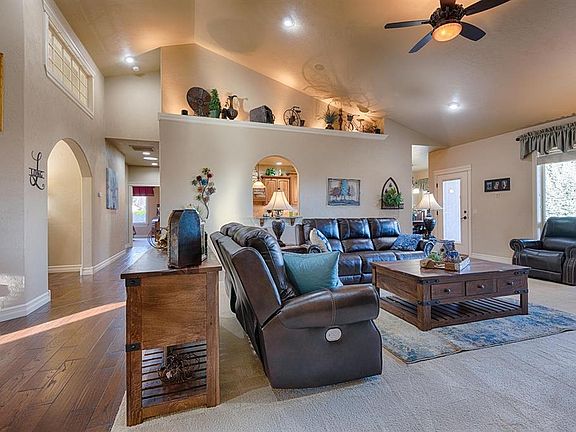 This custom designed luxury home is situated on a corner lot in The Brook subdivision. It is impeccably kept by the original owners whose design and style are top notch. You can't help but love the adorable stoned facade in the front of the home and the beautiful landscaped yard. This 3065 sft home has it all - a split floor plan with 3 bedrooms, 2.5 baths, a formal dining room, office, living room, separate family room, and a kitchen with room for breakfast table. Beautiful solid oak flooring runs throughout the main living areas with carpet in the bedrooms. Enjoy culinary delights in the gourmet kitchen boasting stunning stained hickory cabinets, luxurious granite countertops, stainless appliances, under cabinet lighting and a custom stone vent hood. Cozy up to the pellet stove in the living room or hide away in the family room with a good book. The whole house is wired with a sound system so you never miss a beat no matter what room you are in. Retreat to the luxurious master suite featuring a walk-in closet and a spa-like ensuite bathroom, providing a tranquil oasis for relaxation in the jetted tub or elegantly tiled shower. You can access the covered back patio from the master bedroom or the living room. It is wired and ready for a hot tub, if you want to add one, and a natural gas hookup for grilling. The owners have installed an irrigated garden area and 4 different fruit trees for the perfect summer harvest. Shed is on concrete and has 220 hookup. Additional storage cabinets are provided in the extra large finished 3 car garage. This meticulously maintained home offers a rare combination of luxury, comfort, and functionality, making it the perfect place to call home. Located on the southern side of town, close to shopping, Rec. center, and schools. Don't miss out on the opportunity to make this stunning property yours!