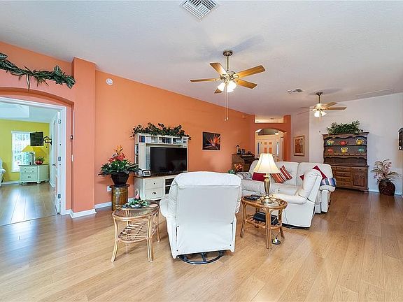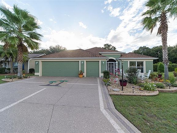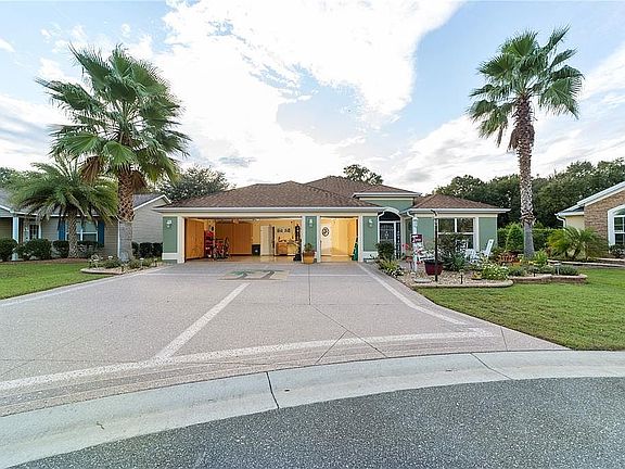 BOND PAID = Lower Taxes! Price Reduction! TURNKEY, MOVE IN READY! This Expanded Iris is located in The Village of Buttonwood next door to Tarpon Boil Golf Course and Buttonwood Recreational/Fish Hawk Centers and conveniently centered between Lake Sumter Landing and Brownwood Paddock Squares. Privacy begins with the Cul De Sac and ends in the no rear neighbor backyard. Newly Painted Exterior! Enjoy sitting at the patio area out front in this quiet neighborhood. Screened and tiled entrance leads your guests into a spacious foyer with the 2 bedrooms(front has tray ceilings) and guest bath(solar light) off to the right. Open floor plan with Engineered Hardwood floors. Bring the outdoors inside with the Centered sliding glass doors that lead to a screened lanai with 24" tile. Kitchen has GORGEOUS Granite and backsplash with S/S appliances and pull out shelves in Pantry with a solar light for natural lighting. Laundry has shelving and plenty of space for MORE! Master Bedroom(currently is showing as a den)has a tray ceiling with a remote fan and located at the back of the home. A New Closet System is waiting for you to organize your clothes! Double sinks in master and vanity area finishes off the Master Suite. Central Vac system for easy cleaning. LETS NOT FORGET THE MAN-CAVE GARAGE! Painted Driveway, Sealed garage floor! ORGANIZATION TO THE MAX with the Tall Closed shelving lining the walls, built in counter/cabinet, and floating/moveable shelves centered between the double doors and golf cart space. ALSO ceiling mounts for all those season items for storage! Wifi Thermostat.