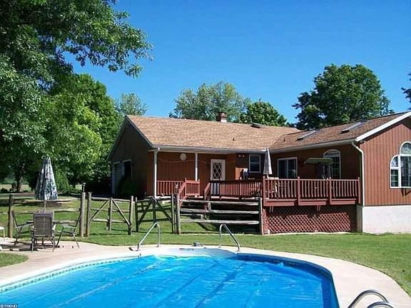 Wonderful Ranch home on 1.96 acres in a park like setting ready for your summer picnic's to include lots of fun entertaining your friends & family with the in-ground pool, solar lights, and a nice size deck nearby for outside dining with sliding doors entering the 20 x 24 Sun room, cathedral ceiling & gas stove for those chilly nights. Home has 3 bedrooms, possible 4th in finished basement, depending on your needs or could be used as an office. There is a wood stove/coal stove in the basement that is big enough to heat the whole house during the winter, electric heat is the alternative. JUST INSTALLED, brand new submersible well pump and tank. Kitchen has granite counters and double sink looking out into the sun room and back secluded yard. There is plenty of storage, pull down attic stairs in garage and attic is the entire length of the house, under the sun room is another area of storage as well as two sheds on the property. A ONE year home warranty is being offered with a reasonable offer, as well as a carpet allowance. 04/06/16