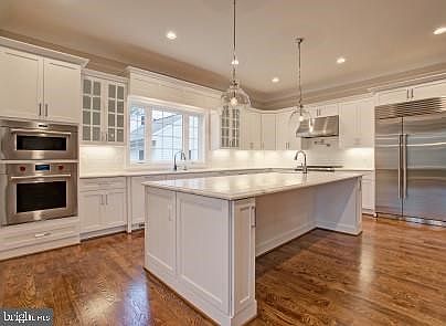 Modern design & luxury are uniquely embodied in this gorgeous new home with 7 bdrms/6.5 baths, complete with hardwood floors throughout main and upper level, extensive detailed crown and baseboard molding throughout, a gourmet Chef~s Kitchen with high end appliances, a main level office/bedroom & full bath, a movie room, a luxurious master bedroom suite and a stone covered porch overlooking a woodsy wonder.