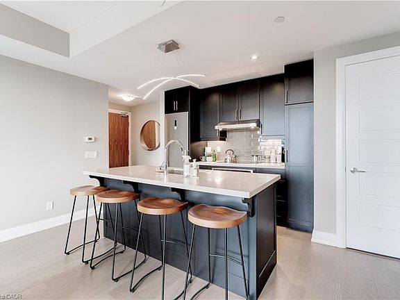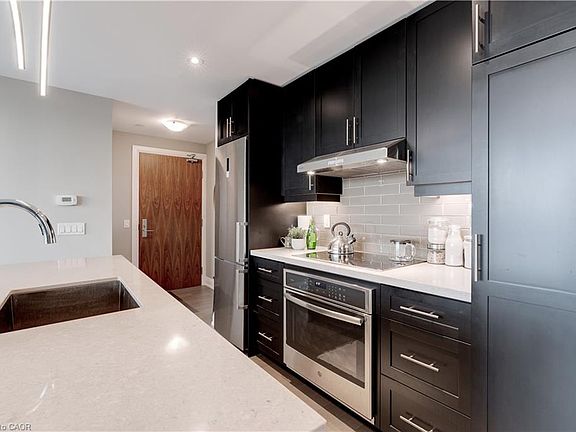 LOCATION & STYLE!!! Beautifully appointed 1 Bed, 1 Bath suite offering 632 Sq. Ft. just steps to the waterfront in downtown Burlington’s sought-after boutique Berkeley Condominium. This thoughtfully planned suite has an incredible layout and a large balcony with stunning views to the escarpment. The suite is fitted with a modern kitchen with island, ample storage, modern-neutral hardwood flooring throughout, an open concept living area that flows seamlessly to a north-facing balcony - perfect for taking in stunning sunsets and views. The spacious bedroom has floor to ceiling windows and ample closet space. The bedroom is conveniently located near the 4-piece main bath and laundry. The in-suite laundry boasts front load washer & dryer and additional storage. Building amenities include a state-of-the-art gym, 24-hour concierge, two visitor suites, games room, party room w/ catering kitchen and elegant dining area, common terrace off party room on the 7th floor and roof top patio with BBQ area, fire pits sitting areas and private dining. One parking space and one storage locker included. Enjoy the vibrant lifestyle with easy access to restaurants, cafes, boutiques, Spencer Smith Park, Joseph Brant Hospital, and Mapleview Mall, all right at your doorstep. Easy highway access and minutes to Burlington’s Go-station.