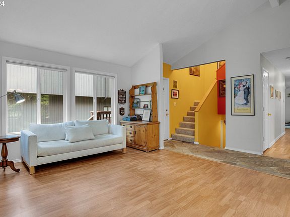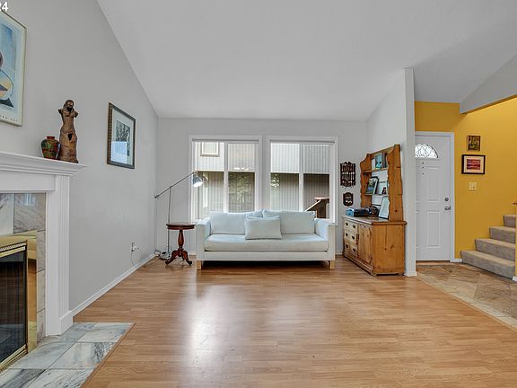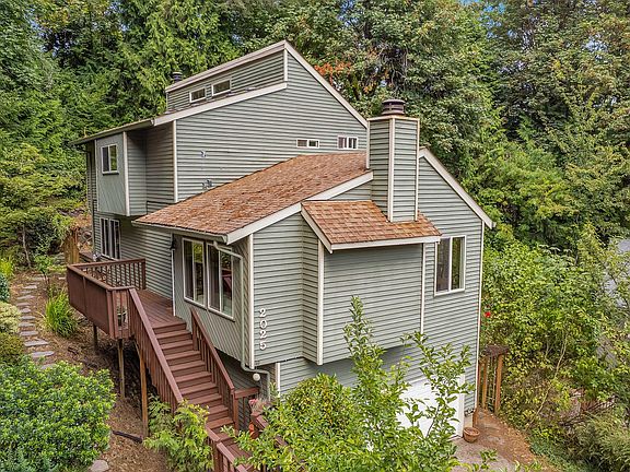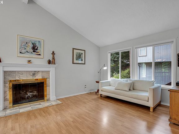 West Linn contemporary home nestled on the hill & walking distance to the river. Beautifully designed 1,822 sqft, 3 bedrooms, 2.5 baths, and 2 car garage. As you enter, you'll be greeted by a welcoming, cozy living room with vaulted ceilings and gas fireplace. Adjacent to the living room, the dining area is bathed in natural light from large windows and highlighted by a gorgeous chandelier. The kitchen is a chef's dream, equipped with stainless steel appliances, granite countertops, a garden window, built-in microwave, dishwasher, and a pull-out drawer pantry. The expansive family room boasts beautiful wood flooring with wood burning fireplace with custom tile and large sliding doors leading out to a covered deck. The primary bedroom is a luxurious retreat, featuring a sliding door to a private balcony, a spacious 7x7 ft walk-in closet with built-in features, and a beautifully appointed ensuite bathroom with marble flooring, double sinks, a striking red tile countertop and backsplash, and a shower with a soaking tub finished with a skylight. Upstairs, you’ll find two sizable bedrooms with built-in closet organizers and vast windows. The backyard is a true oasis, with a mature landscaping and deck multiple decks around the backyard the house perfect for relaxing or entertaining guests and offering peaceful views of lush greenery. This home is ready to provide the ultimate comfort and style. Come see it today and envision your best life here!