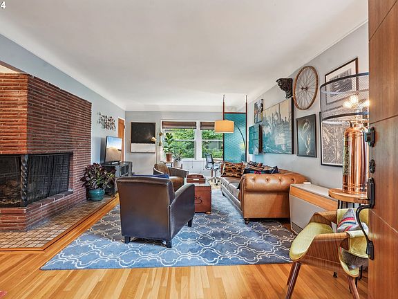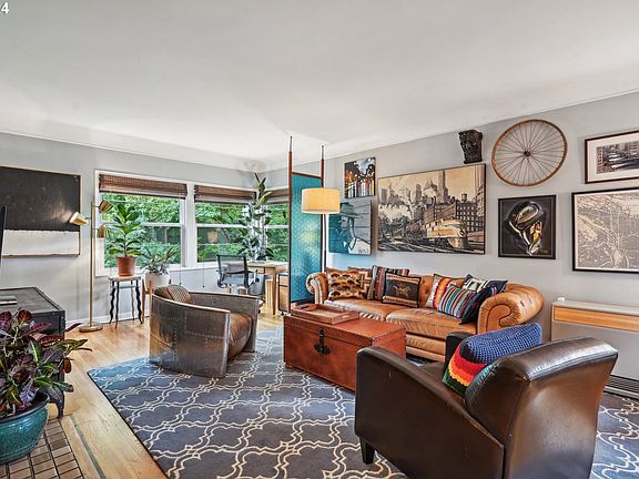 This 1940's mid-century vintage "Jewel" of Terrazzo Condominiums is a unique, rare double-corner unit perched on the top floor above a beautiful courtyard. Serene and quiet, there are NO shared walls, and NO one above you! Safe double-door entry, this unit is nestled away from traffic and noise. One block off historic Ladd's Addition, and only minutes to both Division and Hawthorne Streets. Lots of natural light and views of NE & West Hills. Beautiful hardwoods, corner gas FIREPLACE, stainless steel appliances, Miele Washer/Dryer in unit. Upgraded fixtures and lighting. New custom window treatments throughout the unit. Large custom-built Danish bookshelf and bedroom dresser are earthquake-proof and come with the unit. Deeded garage, 3 roomy closets, locked basement storage unit & secure bike parking, community deck w/BBQ.