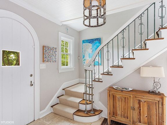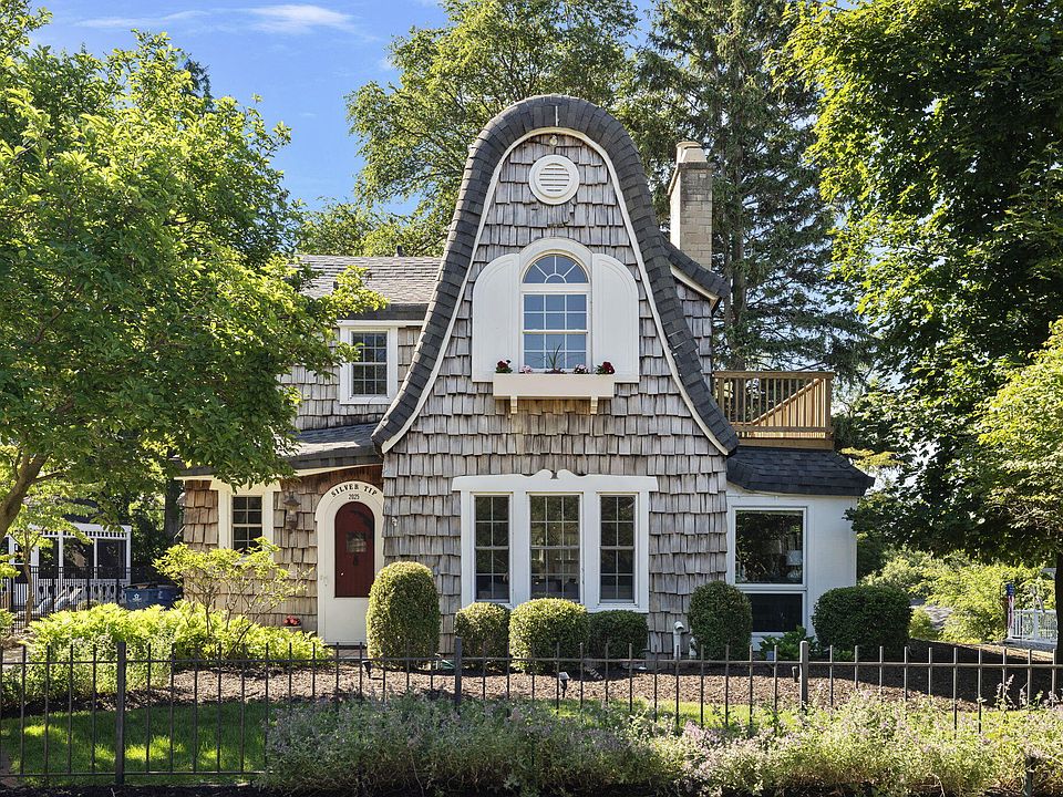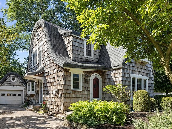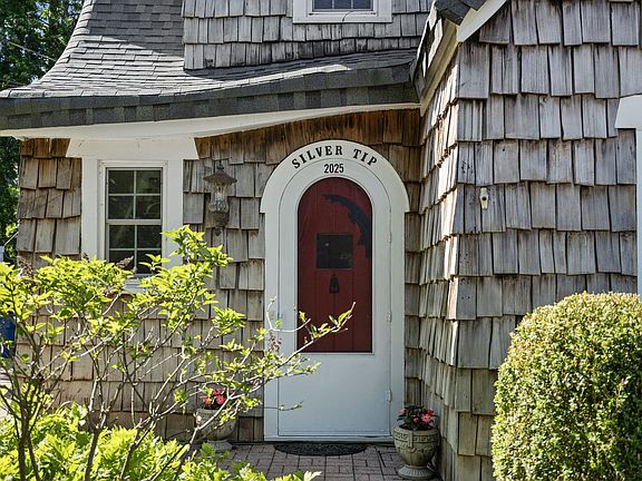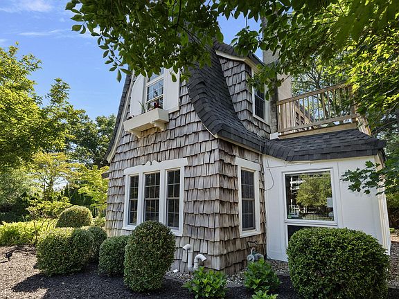 This charming cedar shake fairytale-style home is perfectly situated on a hilltop, ideal for a happily ever after! The exterior enchants with its whimsical roof featuring steep slopes and curved edges, round windows, and stylized shutters. Inside, the magic continues in this completely renovated home, showcasing a stunning staircase with a patina wrought iron baluster and curved railing. Gothic arches lead to the living room, which boasts a wood-burning fireplace with a rounded hearth and ornately carved mantle. The fully remodeled kitchen features Carrara marble counters and crisp white cabinets, opening to a spacious dining area adorned with iron and wood chandeliers. The second level offers three large bedrooms, including a primary bedroom with a private 17-foot balcony with views of the lake. A newer full bath with a marble counter and custom cabinet adds to the charm. The all-new lower level includes a fourth bedroom, recreation area, playroom or optional fifth bedroom, laundry room, and shower room. The beautifully landscaped yard features an amazing swimming pool surrounded by brick pavers, a gazebo, and an outdoor shower. This enchanting home is within walking distance of the private beach association. Owned by a licensed real estate agent.