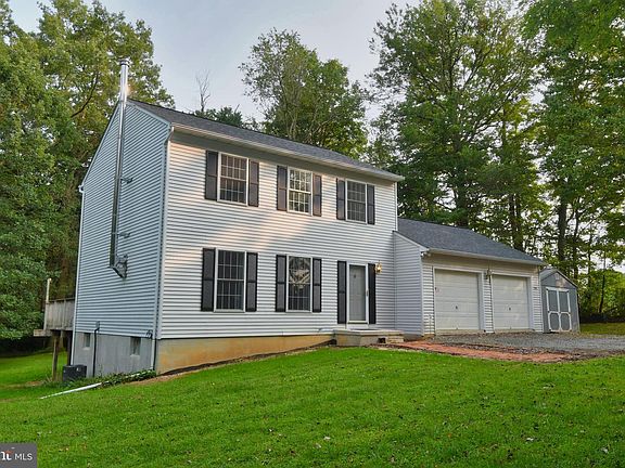 Beautiful partially wooded, large lot with breathtaking views. Enjoy the scenery of the back yard from the maintenance free deck. This charming house has 3 bedrooms upstairs with one full and one half bath. The main level has an open kitchen and dining room with a wood burning stove in the living room and powder room in the hall. There is plenty of room in the oversized 2 car garage with build in work benches. The basement is unfinished and ready for your design. Updates in the past five years include new roof, HVAC and furnace and a tankless water heater. Large propane tank (owned) and partial house generator are included. Walk outside from the basement to the quiet back yard where you will find fig and blueberry bushes, You will have plenty of space in the large 12/20 shed. Additional storage space in the attic over the garage and over the house. Home warranty.