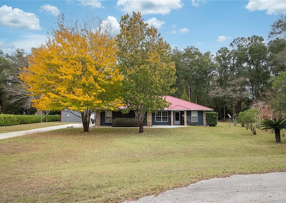 This home exudes southern charm and simple living situated on a 1-acre lot in the back of a quiet neighborhood on a picturesque cul-de-sac! You'll fall in love with the Riverglen neighborhood: it's conveniently located just minutes from downtown High Springs, a short drive to all the local springs, and is zoned for amazing schools. When you arrive you'll appreciate the concrete block construction with stucco finish and a durable metal roof plus a beautiful paver sidewalk and spacious front patio. Step inside to enjoy cathedral ceilings and an open concept living area complete with a dining room, living room, kitchen, and breakfast nook. The split floor plan provides privacy for the owners with a large primary suite and a fully remodeled primary bathroom. On the opposite side of the home are two well appointed guest bedrooms and a full guest bathroom. Step out your back doors to take in the best features of this property, a beautiful back patio with a wood cedar ceiling and a panoramic view of the large backyard perfect for your morning coffee and evenings enjoying the sunset. That's not all...want a workshop for all your toys? Check out the massive 30x46 steel frame workshop with 3 garage doors, concrete slab, electric, a full bathroom, and a car lift! Additional features include: shed with extended pole barn storage, oversized 2 car garage, stainless steel appliances, and so much more! Call today to schedule your showing. **Buyer to verify all property details.**