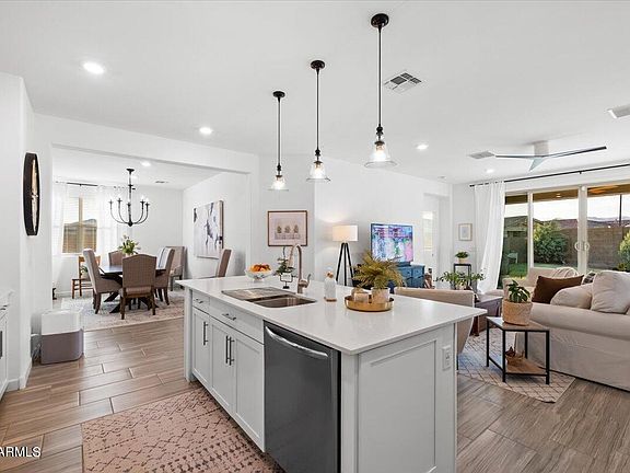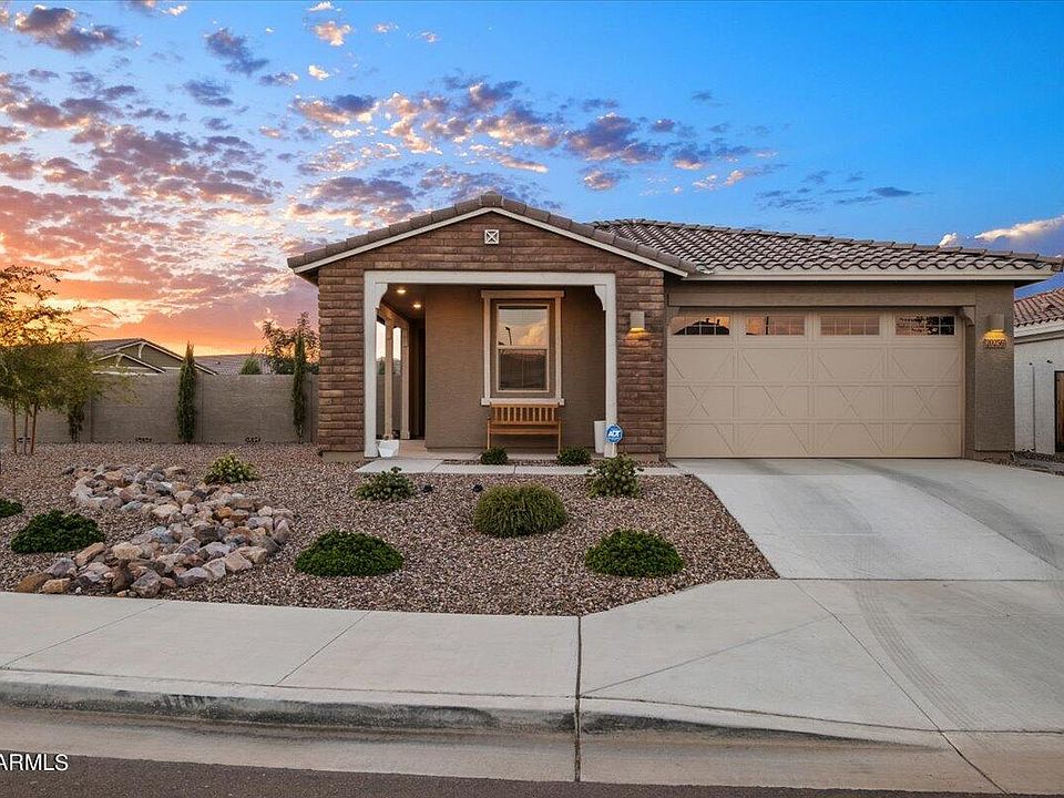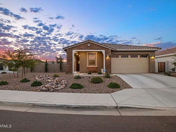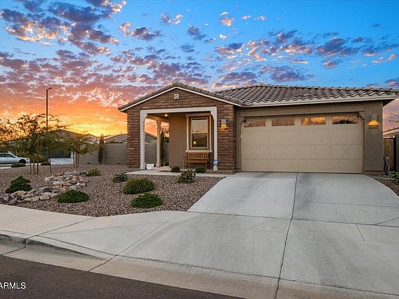 Pristine home in the newest section of Blue Horizons. Built in 2020 by Lennar on an oversized 9,000 sf lot, this Hacienda floor plan checks all of the boxes. The brick facade, wood beams and manicured desert landscape gives the home a real sense of character and charm immediately upon arrival. Once inside, immense pride of ownership can be seen and felt throughout the home. Neutral color schemes in concert with an abundance of natural light give the home a light and airy feel. The upgraded kitchen and great room is perfect for entertaining and features a gas range, quartz countertops, under mount sink, brushed nickel hardware, pantry, large island with bar seating, stainless appliances, and a subway tile backsplash. The great room seamlessly transitions to the backyard through dual sliding doors for easy indoor/outdoor living all year long. Enjoy one of a kind desert sunsets and mountain views from the extended covered patio with automatic sunscreen, upgraded pavers and pre-plumbed gas line. Escape to the private owners suite overlooking the natural grass backyard with dual vanities, walk-in shower, and generous walk-in closet. Split floor plan, walk-in laundry room with added chic built in storage, tankless gas hot water heater, upgraded wide plank tile, quartz in all bathrooms, and a two car garage. Neighborhood is home to Blue Horizons K-8 elementary school. Next door to Great Hearts Rosevelt Prep (8-12). Close proximity to highway 10 for easy access to anywhere in the Valley. Located across the 10 from Verrado, a golf community with 36 holes.