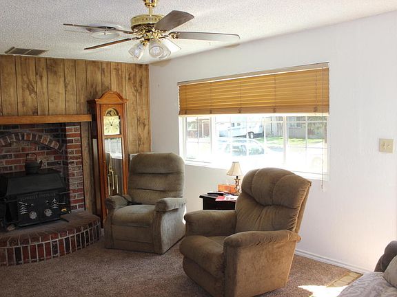 Clean 3 bedroom, 2 bathroom home with large 20' x 24' detached 1 car garage with an additional 20' x 24' shop. Kitchen features nice oak cabinets with corian countertops. Large bonus room off of kitchen. Home has dual pane windows, metal roof and swamp cooler. Large patio with coy pond in backyard.