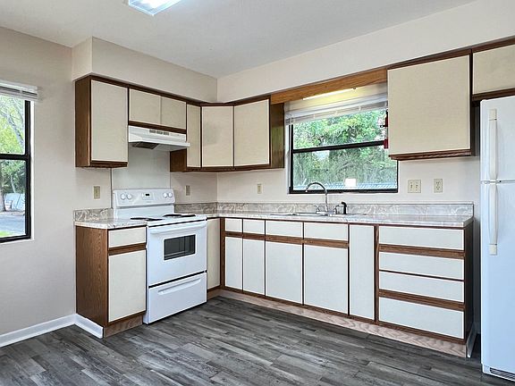 - Bright, open kitchen with abundant cabinet space and large windows overlooking greenery