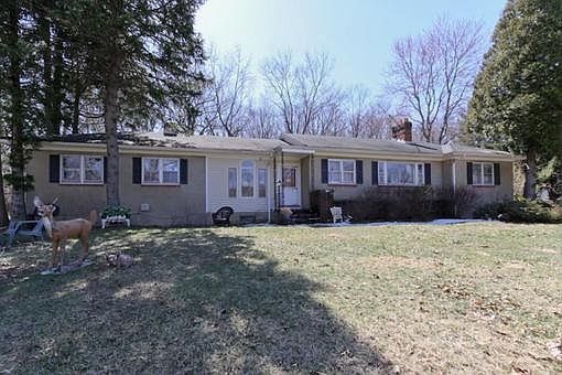 Spacious Ranch with oversized 2 car garage! Bright and sunny through-out. Unique floor plan! Hardwood floors, brick fireplace, ceiling fans, private wooded rear!