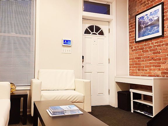 This property rents to ONE PERSON PER ROOM and is a shared housing environment. Enjoy a FULLY FURNISHED townhome available to traveling professionals in an ideal roommate layout, steps away from Johns Hopkins Hospital. Leases are a minimum of 90 days at this property; longer leases are also welcome. As you enter the home, you arrive in the sitting area with the staircase to the upstairs bedrooms within a few feet. The sitting area flows into the dining room where you are led to a galley kitchen fully equipped with a refrigerator, electric stove, microwave, dishwasher, kettle, air fryer, utensils, cookware, seasoning, fire extinguisher, first aid kit, and cleaning supplies. Two queen-sized bedrooms with private bathrooms are located upstairs on opposite ends of the home. Your bedroom is just off the top of the steps to the right and is an ensuite. The second bedroom is down the hallway with access to its own private bathroom. The third bedroom is located on the main level just beyond the kitchen with a full-size bed. All bedrooms/bathrooms have a keyed lock entry for privacy and the home is topped off with hallway access to the rooftop deck. You provide your own linen (mattress cover is required), towels, and bathroom essentials. No car? No problem! You will be located within two blocks walking distance of the Wolfe Street entrance of Johns Hopkins Hospital. Johns Hopkins Bayview Medical Center along with many other Baltimore hospitals are a short drive or bus ride away (including Loch Raven VA Medical Center, UMMC, Medstar Union Memorial, Grace Medical Center, Sinai Hospital, and Mercy Medical Center). Paterson Park, Canton, and Fells Point are all within walking distance for local biking, dining and waterfront strolling. Access to the basement is restricted. -No smoking allowed. -No pets allowed. -Guests are limited in a shared house environment. -Quiet hours are currently from 10pm to 7am.