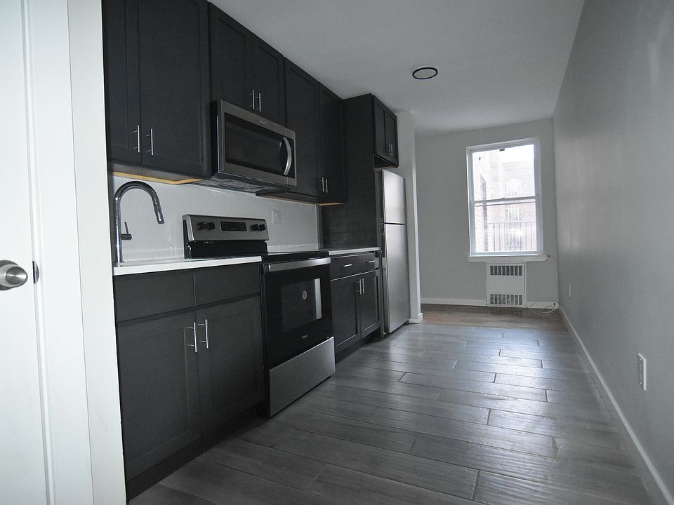 Renovated studio. large open bedroom/living room with closet space and renovated bathroom kitchen. Wonderful balance of light through large windows. outdoor space. Heat and Hot Water included.