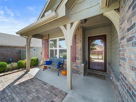Adorable Bixby home W/ great yard in fabulous neighborhood filled w/ amenities. All one story, great kitchen w/ gas stove, view into living, eat in dining area, granite counters and pantry! Split plan with Master having 2 walkin closets and en suite bathroom with separate tub, shower, private toilet area and dual sinks! Two more bedrooms with hall bathroom & two car garage. Living room is spacious with fireplace and could be a formal dining area space too. Extended patio, trees for privacy, move in ready!