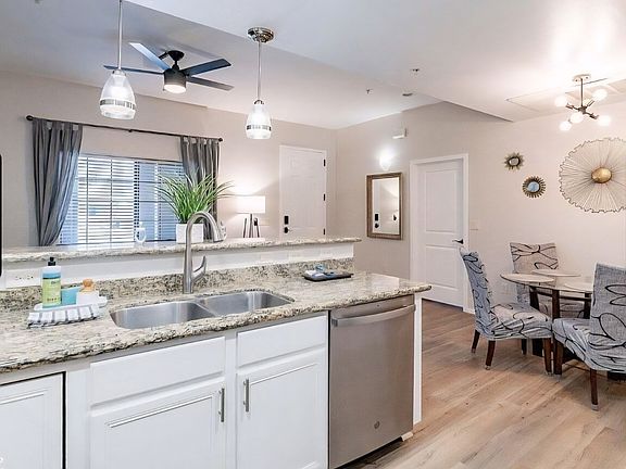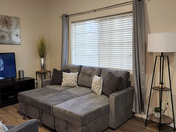 This spacious one bedroom, one bath, ground level condo in the Placita Escondida condominiums comes fully furnished with modern decor, new energy efficient washer/dryer, dishwasher, and his/hers sinks. There's a king bed, comfy pull out couch for guests, and calming colors to relax in. Just bring your personal items and enjoy the walk-in closet, separate linen closet, in-house walk-in laundry room and outdoor patio. The community has a pool and jacuzzi and is steps to from the Rillito River Park walk (a 12-mile-long linear path in Tucson that runs along the north and south banks of the Rillito River bed). It's a sport enthusiasts favorite. There is plenty of parking and the condo is just 10 minutes from the University of Arizona, about 15 minutes from all major hospitals, and about 12 minutes to downtown Tucson. Luxury, location, and convenience all in one!