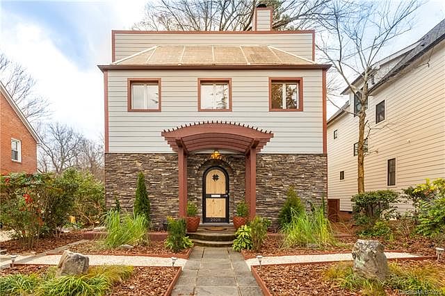 Super-cool contemporary home just steps away from Freedom Park and East Blvd. shops, restaurants, and wine bars! This location could not be more fun - and along with a really unique, artistic, and well-taken care of home with additional "apartment", this property could not be more special. You'll love the high ceilings, tons of natural light, and oasis-like feel of this home; note the gorgeous landscaping, huge deck with fire pit and outdoor TV overlooking the green space between this home and Freedom Park. Inside, the custom features like built-in bookshelves, custom-built wood wine storage, huge owners suite with windows so large it gives a treehouse-like feel, laundry chute, and art niches abound. The quality and craftmanship throughout will not go unnoticed! Secondary building is being used as a resort-like gym (air/heat controlled, TV, large windows overlooking garden!) but would also be great for an office or studio. All new siding installed last year!