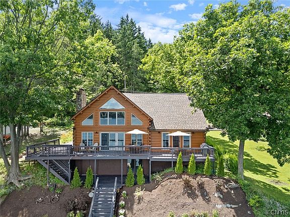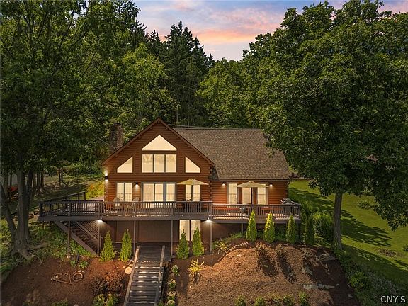 Discover the epitome of luxury lakefront living with this exquisite 3-bedroom plus a loft, over 2,500 sq ft log home nestled on the serene central west side of Otisco Lake with 101’ waterfront, near Glen Cove and Ladder Point. Boasting deep water access perfect for fishing enthusiasts, this stunning property features a cathedral ceiling and a showcase fireplace, adding to the rustic charm. The home is equipped with modern conveniences such as a wood/pellet stove, a new washer and dryer, and new kitchen appliances. Recent updates include a new roof, fresh interior paint, stained exterior, updated landscaping, updated kitchen counters, baseboard heating, new water pump, a freshly stained deck, and much more.The beautifully landscaped property offers panoramic water views, making it an ideal retreat and perfect spot to take in the stunning sunrises.