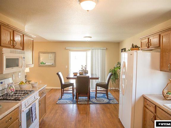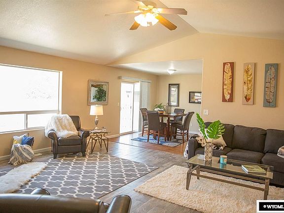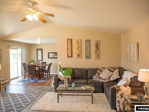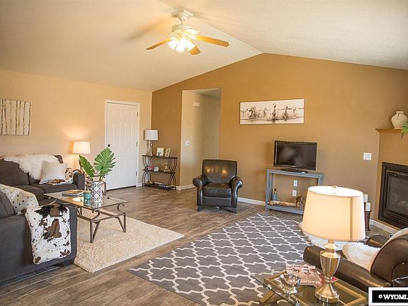 Qualifies for 100% Rural Development financing. Ranch style with finished basement could easily be split into two living quarters. Main floor & below grade laundry. Bonus extra kitchen area in basement. Vaulted living room w/gas fireplace. Master suite. Central air. Attached heated two car garage with 220 and a detached toy garage & RV Parking. Corner lot. Steel siding. Great home. Call Ashley to tour 307-262-5132.