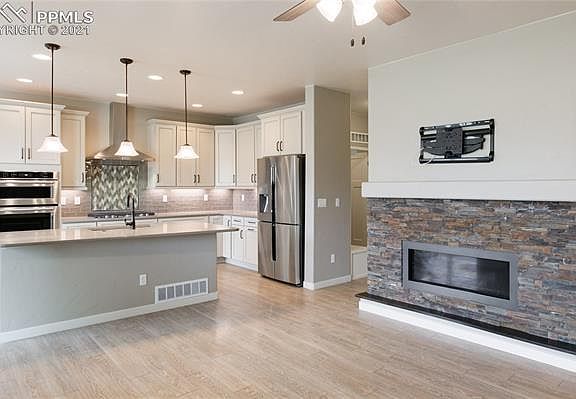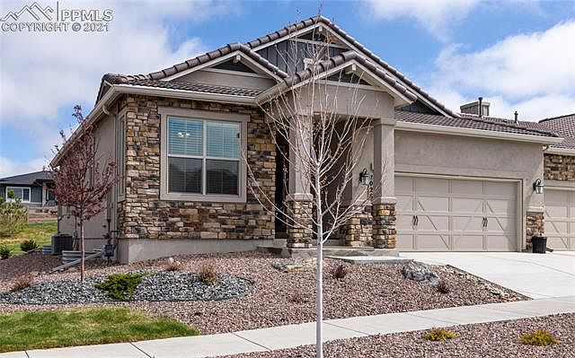 Immaculate, impeccably cared-for, like-new paired patio home with mountain views in highly desirable lifestyle community of Flying Horse ~ Classic Homes Legends Collection ~ 2x6 construction ~ open main level floor plan with a chef's dream of a kitchen w/quartz countertops & designer backsplash w/undermount cabinet lighting ~ huge breakfast bar island w/quartz slab counter ~ stainless appliances & gas cooktop ~ 42" cabinetry ~ spacious walk-in pantry w/wood shelving ~ light and bright living room w/rectangular contemporary stone surround fireplace & TV mount ~ recessed can lighting ~ main level master suite w/double vanity & tall tiled shower & oversized walk-in closet ~ bedroom by front entry w/mountain views could be used as office ~ quartz vanity countertops in all bathrooms ~ laundry room by garage entry ~ lower level offers 9' ceilings ~ two bedrooms w/full bath along with large family room w/gas fireplace and beautiful granite counter wet bar with beverage refrigerator ~ large utility room w/storage ~ home has upgraded CAT wiring ~ mountain views from front and rear of property, incl. front porch views of Pikes Peak and USAF Academy ~ rear covered patio off dining area w/views as well ~ close to a variety of amenities offered by the Club at Flying Horse, including steakhouse dining, day spa, fitness classes and activities such as golf, tennis, swimming in resort-style pools, pickleball, basketball ~ (please Google Flying Horse Club membership packages) ~ maintenance free exterior w/snow and trash removal included ~ convenient, easy access to hiking trails, I-25 corridor, restaurants, services, shopping, theaters and more! A beautiful must-see move-in ready home !