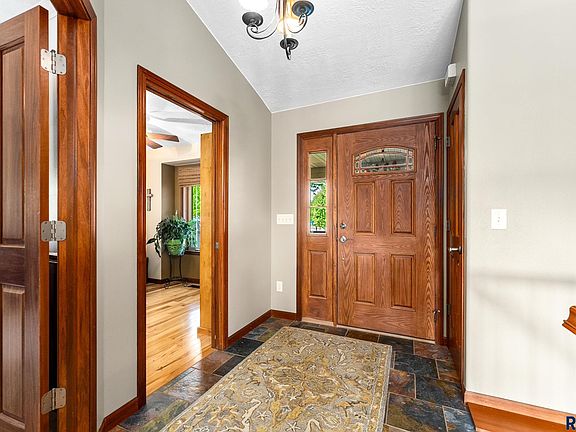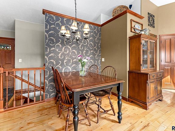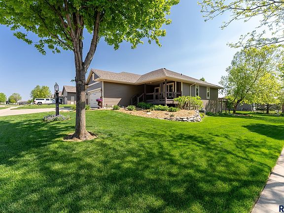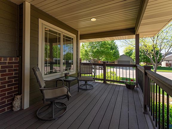 Stunning custom built one owner ranch style home located in southwest Sioux Falls! From the moment you enter you'll appreciate the attention to detail throughout including hickory & maple wood floors, in addition to slate & travertine tile floors. Open concept dining/living room with a vaulted ceiling & an inviting kitchen with rustic cherry cabinetry, a large center island, granite countertop, corner pantry, & a door to the trex deck. Complete with the coveted 3 bedrooms on the main level, including the spacious master with an ensuite & walk-in closet, an office, additional full bath, & handy laundry/drop zone. Step down to the impressive family room with a cozy gas fireplace. Finished off with 2 additional bedrooms & a full bath. Ample storage space & a 3 stall garage. On a corner double lot with attractive curb appeal, an adorable covered front porch, mature landscaping, & a patio/pergola. Convenient location close to schools, parks, & amenities!