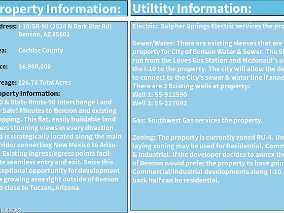 Lot 1. I-10 & State Route 90 Interchange Land For Sale! Minutes to Benson and existing shopping. This flat, easily buildable land offers stunning views in every direction and is strategically located along the main corridor connecting New Mexico to Arizona. Existing ingress/egress points facilitate seamless entry and exit. Seize this exceptional opportunity for development in a growing area right outside of Benson and close to Tucson, Arizona. Sulphur Springs Electric services the property. The propert
