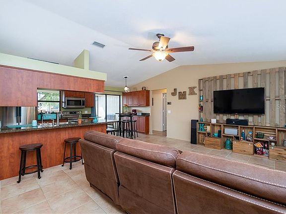 Beautifully updated move-in ready home located in Port Charlotte. This home offers open concept living perfect for entertaining. The kitchen has updated cabinets, stainless steel appliances and a bar area that over looks the living space. This lovely home features 4 bedrooms for a large or growing family. 2 bedrooms have carpet and bifold closet doors; one bedroom has tile with a walk-in closet with all including large windows to let in the Florida sunshine. The master bedroom has laminate wood flooring and enough room for your king-sized bed. The master bath features a large barn door that leads into the double vanity, separate toilet area and walk-in shower with multiple shower heads. The master bath also has a vanity area with attached mirror and overhead lighting. The master closet has an expansive closet system. The lanai is a great outdoor living space with beautiful views of the large backyard shaded by mature oaks trees and enclosed by a 6-ft. privacy fence.