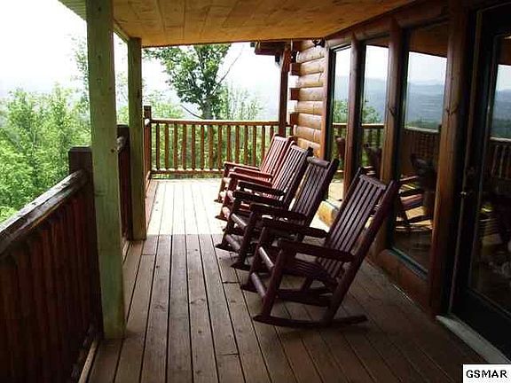A gorgeous cabin with breath taking views located in a quiet , peaceful neighborhood at the end of the cull-d-sac. Upscale furnishings. Spacious rooms just the right size for large family get togethers. There are 2 additional rooms on lower level set up as bedrooms. All bedrooms have king bed except one which has a double Queen bunk bed. Each bedroom has its own bath. Some bedrooms have a fireplace. Large covered deck perfect for grilling out and enjoying natures beautiful surroundings.