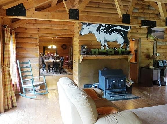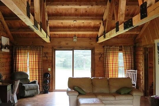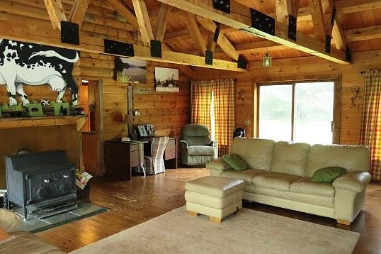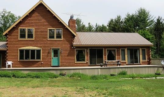 Adirondack Log Home with 17 acres that has both private and picturesque country surroundings. Spacious great room with cathedral ceiling highlighted by post and beam rafters, wood floor and a wood-stove set upon a slate hearth with copper backing. Dining area is open into the kitchen which features a Dynasty Gas Range, a mix of hardwood and pine cabinetry and designed for entertaining. Master bedroom on the first level and there is plenty of room for either friend or family with three bedrooms and a full bath on the second story. Addition has guest quarters that contains its own living room, kitchen, bedroom, bath and laundry. Large deck out front, 2 car garage, barn and pond.