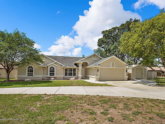 Come and see this beautiful home that sits nicely on this large corner lot with extended driveway and extra parking. There is a nice utility shed and covered/paved boat or RV storage. Enjoy the privacy of your fenced back yard with over-sized pool. Accent lighting in kitchen and main bath. New carpeting, new paint, kitchen updates, new ceiling fans and lighting, dimensional shingle roof, updated HVAC, pool bath, landscape curbing, irrigation well too.Repaired sinkhole with full warranty. This one has a lot of extras.