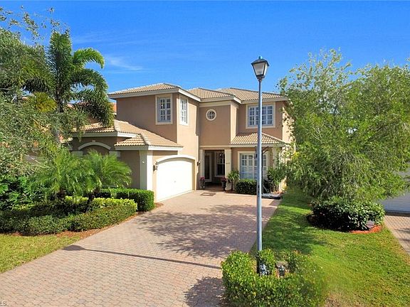 This spacious 5 Bedroom, Den/In-Law suite, 4 Bath, "Osprey" floorplan home is located on a premium lot with Easterly views of Arrowhead Golf Course. This home features elegant Living & Dining Rooms with upgraded white staircase, rich moldings, and plantation shutters. To the back of the home, you will find the Kitchen along with a Breakfast Bay, which is all open to the Family Room with Sliders to the lanai. There is also a bedroom, full/pool bath, and den on the first floor. The SECOND FLOOR MASTER SUITE is fit for a King with separate Sitting Area/Exercise Room, Two Large Closets, and His & Hers Bathrooms! The laundry room is conveniently located on the second level with 3 additional bedrooms and bath. This home has many upgrades and features including side load garage, Heated Pool, Two-Story Cage, Granite Counter Tops, Stainless Steel Appliances, Diagonal Tile, Plantation Shutters, Crown Molding, and Extensive Molding Details. ONE YEAR HOME WARRANTY INCLUDED. Saturnia Lakes offers a resort pool, gym, saunas, ballroom, billiards room, 4 tennis courts, basketball court, and more! Just 10 min to Mercato, 15 min to the Beach, and 25 min to 5th Ave/Coconut Point/RSW Airport.
