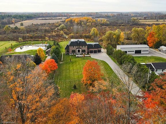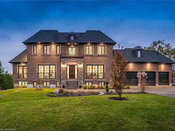 This exquisite custom-built home is situated on nearly 2.5 acres in North Dumfries, just south of Cambridge, Ontario. Head down the 200'+ driveway and this 100' wide residence greets you with a classic red American-style brick and natural tiger stone accents, copper dormers with bell roofs, and wide fibreglass entry door. Step into the 2-storey foyer to find separate living and dining rooms, complete with wainscoting and accordion bi-fold doors that allow you to bring in the fresh country air. The main and second levels are appointed with engineered hardwood floors, contemporary crown moulding and 8 ft. tall doors. The butler pantry (complete with bar fridge and sink) connect the dining room to the gourmet kitchen, where there is no shortage of space in the full height pantry or the custom walnut island. A dedicated study with vaulted ceiling can be found on the main level. The primary suite offers a sanctuary with a walk-in closet and spa-like ensuite with heated floors. The skylight makes the second floor nook the perfect place to cozy up with a coffee and a book. The finished lower level is flexible for entertaining and for multi-generational living with features like 9' ceiling, wet bar/kitchenette, large windows, walk-out to concrete porch, soundproofed 6th bedroom (that is currently used as a home theatre) and separate garage entry. Energy efficiency can be found in the home's triple glazed windows, spray foam insulation, and upgraded Carrier furnace. Embrace the panoramic country sunset views in the 3-season glass sunroom, featuring an additional 392 sq. ft. of space, pine ceilings and southern exposure. No matter what your hobbies entail, this property is well suited to help you enjoy them, such as the extra deep, fully insulated 3-car garage for parking your toys or practicing your chipping on the 260'+ deep backyard. Nestled on a quiet street among other estate homes, 2029 Morrison Road offers both luxury and convenience in a sought-after location.