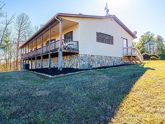 This ranch style home is located on 6.98 +/- acres and is nestled a top a hillside overlooking the pond. The living, kitchen and dining areas are open to one another and a den/flex/rec room is located off the living area for additional space. Down the hall you will find 2 guest bedrooms, a guest bathroom, a primary bedroom with an attached bath & large walk-in closet. The laundry area is also located on the main floor. A sunroom with insulated windows & a window air conditioner is located off the back of the home and exits onto the open deck. The covered front porch spans the length of the home and is perfect for enjoying the mountain view. A full basement with interior and exterior entrances provides 2 enclosed parking spaces. Outside you find a 50x30 shop with a bathroom (former cycle shop), 30x30 tractor shed, 21x26 shed with stalls for animals or extra storage, 20x20 carport and a few other storage buildings. This one has so much to offer - schedule your appointment today!