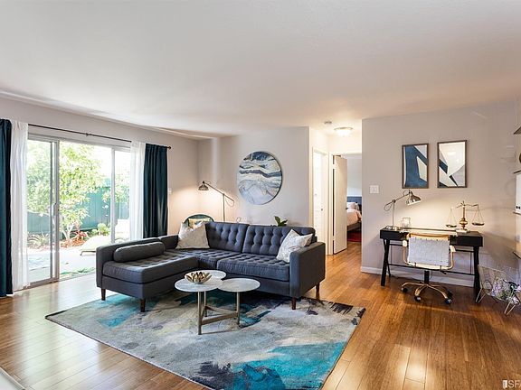 South Shore Lagoon Condominiums. Serene, rear 1 bedroom, 1 bath unit all the way in back of the complex. Ground floor location, no stairs, with a beautiful, sunny, private garden and enclosed patio. Spacious living room with a large closet. Remodeled electric kitchen with lots of cabinets, crystal knobs/hardware, Carrera marble counter top, porcelain tile flooring and newer appliances. Bright dining area in the kitchen. Full tiled bath with Carrera marble counter, crystal knobs and hardware, and porcelain tile flooring. Bamboo laminate flooring in entry, living room and bedroom. 1 car carport parking. Common laundry room. Lovely landscaped gardens, 2 swimming pools, and easy lagoon access for recreation and relaxation. Wonderful location in South Shore neighborhood on the island of Alameda. Near South Shore shopping center, parks, beaches, Alameda Point Sunday flea market, Ferry Terminals, and quaint shopping districts of Parks St. and Webster St.