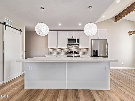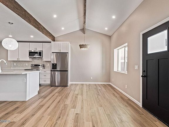 ONE OF A KIND BEAUTY! Beautifully remodeled 3 bed, 2 bath property with HUGE lot and views of downtown! Prepare to be impressed by a pleasing interior offering wood-look floors, soothing palette, dramatic vaulted ceilings w/exposed beams, & recessed lighting. The stunning kitchen boasts white shaker cabinets, sparkling SS appliances, stylish backsplash, quartz counters, a trending barn door opening to the large pantry, & an island with a breakfast bar. Classic yet modern interior will conquer you! Main bedroom features a lavish ensuite with dual sinks & soaking tub, walk-in closet, & French doors leading to the fabulous balcony. Plenty of parking space and super easy low care yard. Spacious backyard is ready for you to host fun gatherings! What are you waiting for? Call Alex with any questions 520-237-8411
