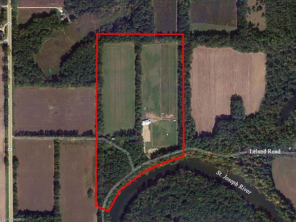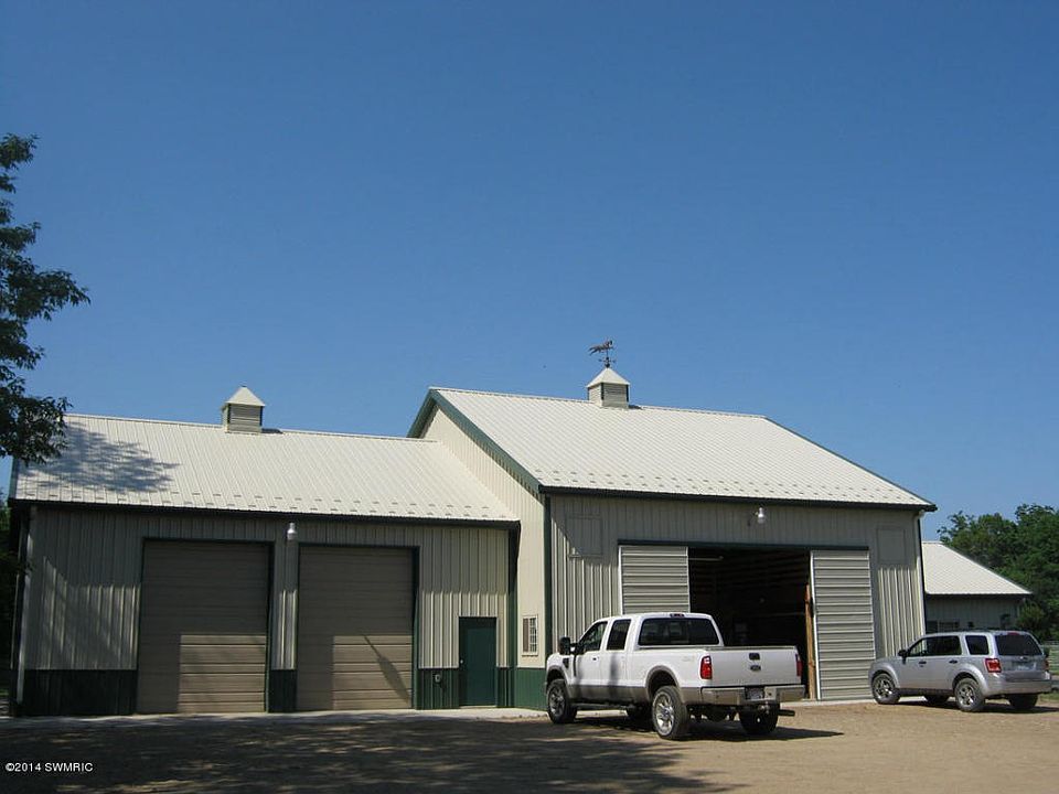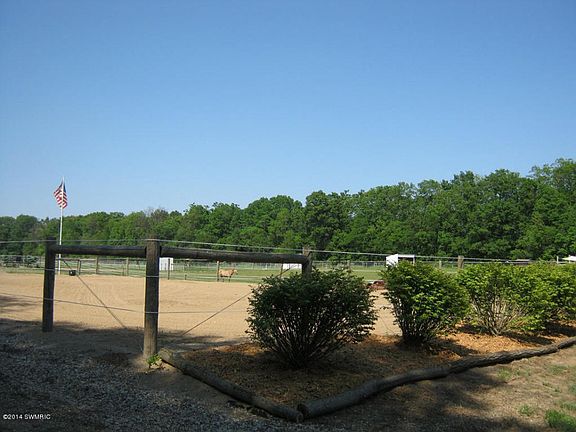 Horse property built in 2010. Has 3 adjoining areas including equipment storage, stable, and studio-style living quarters (club room). The equipment storage area is 36x36 with four overhead doors for easy drive through access. The stable is a 48x36 area in the center of the barn. It has six large 12x12 stalls with Nelson auto-waterer, soft pro floor flooring covered with rubber matting and quality stall fronts and dividers. Has a wide center aisle. Ample hay storage with a hay chute for easy fee ding. Heated feed and tack rooms. The 24x24 clubroom has many of the same features of a studio apartment including a bathroom with shower, kitchen, lounge area with gas fireplace, cathedral ceiling, closet, and extensive deck. 10 acres planted in alfalfa hay, 6 acres wooded and the remaining 20 acres occupies by the barn, outdoor training arena, and 4 pastures each with shelters and auto-waterer. There are several potential building sites available. Property includes St. Joseph River ftg.