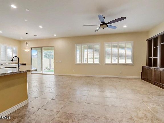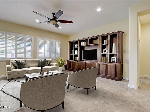 This 3 bed/2 bath 3 car garage Queen Creek home with pool in Victoria is a dream come true! As you approach the inviting entry lined with pavers and artificial turf, you will be welcomed to the expansive open floor plan with a built in entertainment center. The kitchen overlooks this space and has been tastefully designed to include granite counters, staggered cabinets with pull out shelving and extended cabinet space. The walk in pantry even has an electrical outlet! The split floorplan has neutral tile t/o, shutters and ceiling fans in every room. Wait until you see the primary bedroom features! The double sink vanity has decorative cabinets with separate shower/tub combo and the walk in closet is incredible! Classy Closet design perfectly on display here with organized space, soft close drawers, a built in desk and custom hand carved table tops! The upgrades keep going! As you exit the backyard WOW is in order with a 3 year new pebble tec salt pool with water features surrounded by desert oasis palms and no maintenance artificial turf creating the perfect outdoor enjoyment. Bonus RV gate, gas bbq stub and extended patio! This original owner finished off the improvements with custom cabinets and built in sink in the laundry room. A truly loved home with thoughtful and practical design in every inch exists right here on Quintero Road. WELCOME HOME!