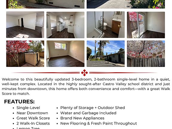 One level apartment with no one above or below. Everything remodeled in last month. New appliances too. Nice 10 unit complex. Great Castro valley school district. Nice back patio with shed and lemon tree. Walking distance to shopping and BART. Owner pays water and garbage. No smoking. One parking spot in complex. Otherwise street parking.