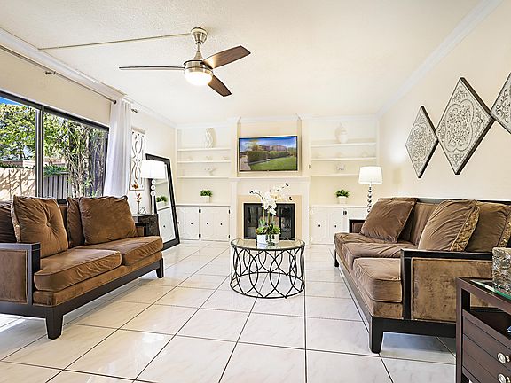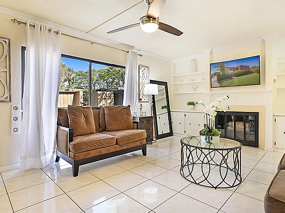 Sandalwood Estates 2 bedrooms, 2 1/2 baths in the heart of Palm Beach Gardens. This townhome has an updated kitchen that was opened up to create a spacious eat in area and offers new stainless appliances. Neutral tile throughout living area, built in shelving and cabinets around fireplace. Master suite has a large walk-in closet with built-in shelving and drawers. Master shower was updated and has solid glass doors. Exterior of this property includes a storage shed, accordion shutters, new roof 2021, and a large fences patio area. Down the street from Gardens Medical Center and very close to the Gardens Mall, tons of restaurants, and out door activities.