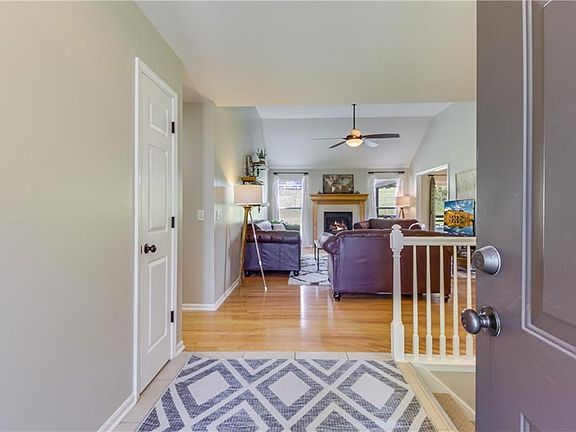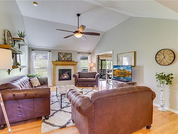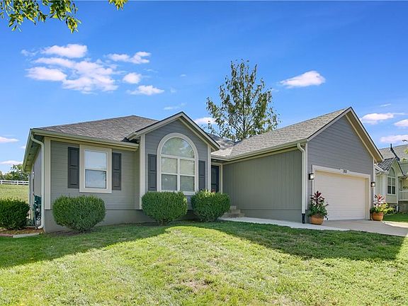 Spacious one level living in a meticulously maintained true ranch. This home is perfectly laid out for maximum one level accessibility. Gorgeous wood floors greet you in the open living room with a warm focal point of the tiled fireplace and wood mantle. Large Living room (20x13) has beautiful vaulted ceilings and lots of natural light. Kitchen/ Dining combo leaves plenty of room cooking, entertaining, and spending time together. Kitchen has updated hardware, light fixtures and countertops. Two spacious bedrooms face the front of the home. All bedrooms have high quality high traffic carpet for comfort and longevity. The hall bathroom includes beautifully updated mirror with tiled floor and full shower over bath. Primary Suite includes tray ceiling with fan and graciously spaced windows. Pocket doors lead to the bathroom with separate tub/ shower, double vanity, and private water closet. Entry to large closet is through the bathroom. Oversized lot includes many mature shade trees, and manicured landscaping. Covered deck with built in seating is perfect for those cool Fall evenings or watching the rain fall in the Spring. Yard backs to greenspace with fishable pond and no neighbors across the white fence. Home is located at the back of the neighborhood providing serenity on the quiet street. Located just minutes from stores in beautiful Harrisonville.