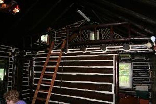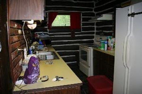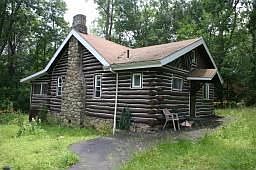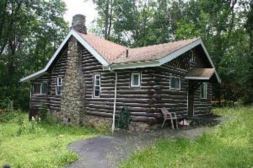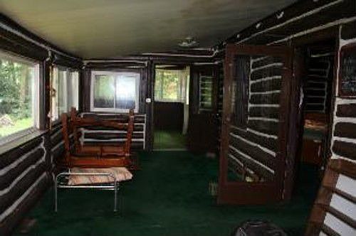 Location! Around corner from clubhouse w/seasonal view of BIG lake. Traditional log home w/full bsmt. Large liv/din combo w FP("as is")Newer windows.Updated bath.Wood floors under carpet. Trap door from family rm (former porch) to bsmt. Extra porch room finished. Large loft over bedrooms.Charming.FP used by owner but admin. has no knowledge regarding same- being sold "as is".