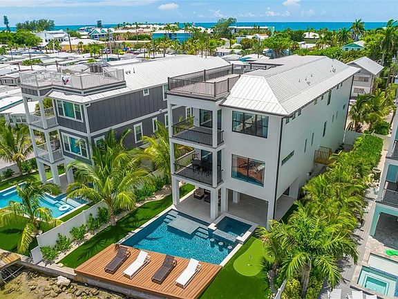 A rare opportunity to own one of the most impressive bayfront estates on Anna Maria Island, where panoramic water views, refined coastal architecture, and island living come together in a truly unforgettable setting. This exceptional 8 bedroom, 8.5 bath home offers more than 3,500 sq ft of luxury living directly on the bay in Bradenton Beach, delivering an unmatched combination of elevated modern design, premium construction, and the quintessential Island lifestyle. Floor-to-ceiling windows showcase sweeping open-water views and bring natural light into the spacious living and dining areas, while the gourmet kitchen features quartz countertops, custom cabinetry, high-end appliances, and a large entertaining island ideal for gathering with family and guests. Multiple balconies and outdoor living spaces create a seamless indoor-outdoor flow, capturing sunrise views over the bay and cooling sea breezes throughout the day. The outdoor experience is resort-like, with a private pool overlooking the water, generous covered seating areas for shaded relaxation, and direct waterfront access for paddleboards or boating enjoyment. A rooftop deck provides dramatic panoramic views of the Intracoastal and skyline, making it an unforgettable setting for sunset evenings and waterfront entertaining. The property is topped with a metal roof and built to modern coastal standards for durability and peace of mind. Each of the eight bedrooms is designed as an en-suite or semi en-suite, offering exceptional comfort and privacy for guests. The layout accommodates large families and group gatherings with ease, while still feeling private and thoughtfully planned. An elevator makes moving between floors effortless for residence and guests. Currently operated as a luxury vacation rental with strong income history and bookings in place, the home offers both exceptional lifestyle appeal and proven rental performance. Situated on one of the most desirable stretches of Bradenton Beach, this residence embodies the reason waterfront ownership on Anna Maria Island is so sought-after — a rare opportunity to live directly on the bay while being just a few blocks from the Gulf shoreline, island dining, beach markets, boutique shopping, and the relaxed coastal character that defines life on AMI.