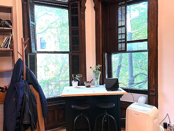 One bedroom in North Park Slope in a charming historic brownstone. A 2 block walk to Prospect Park and a block from the Park Slope Food Coop, this apartment is located on a quiet, tree-lined street. This sunny, 3rd floor apartment has tons of original Victorian detail including tin ceilings, decorative fireplace, built-in bookshelves, hardwood floors, and ornate mahogany moldings. Renovated kitchen and bath with marble shower and floors. Laundry and free bike storage in the building. Storage lockers available for rent in the building. Steps from the B,Q, 2 3, Grand Army Plaza, supermarkets, Yoga studios, bars, and restaurants. NO FEE! AVAILABLE AUGUST 1, 2025 - WITH FLEXIBILITY FOR A JULY 15TH MOVE IN SMOKE FREE SORRY, NO PETS. We don't have a video of this apartment yet, so I posted the video of a nearly identical unit one floor above to give you an idea of the apartment - the differences between the units are: this one has a larger kitchen, a brick fireplace and one less bookshelf.