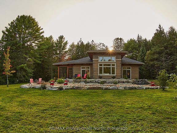 Nestled along the pristine Muskoka River sitting on 1.37 acres and 215 feet of riverfront, just minutes from downtown Bracebridge renowned for its small town charm and as a gateway to the natural beauty of Muskoka this award-winning luxury custom log bungalow offers timeless elegance and modern convenience in a premium riverfront setting. Located just off Highway 11, the property delivers ideal accessibility while offering serene privacy that feels worlds away. Built in 2020, this meticulously crafted True North Log Home greets you with impressive curb appeal and thoughtful detail at every turn. Inside, the 8x12 white pine logs, soaring ceilings, white-washed pine accents, and rich dark wood beams set a warm and sophisticated tone. The open-concept layout features 3 spacious bedrooms and 2 full bathrooms, with radiant in-floor heating powered by a propane boiler, plus a forced-air furnace and central A/C ensuring year-round comfort. Maple flooring flows throughout, accented by granite stone and tile in the entryways and bathrooms. The chef-inspired kitchen with a 10'x5' island is perfect for entertaining gatherings of any size, while the great room showcases a stunning granite floor-to-ceiling wood burning fireplace. The Muskoka room offers a peaceful retreat to take in the sounds of nature. while the primary bedroom is a true sanctuary, complete with a walk-in closet, elegant ensuite, and a granite stone walkout to a private sunken 7x7 hot tub. Outside, professionally landscaped gardens feature natural granite, river rock, and cedar mulch. The fully insulated 26'x25' garage is not to be overlooked, offering in-floor heat, dual floor drains, 8'x9' automatic garage doors, and wired for an EV charger ideal for luxury vehicles or passionate hobbyists.