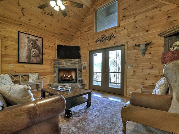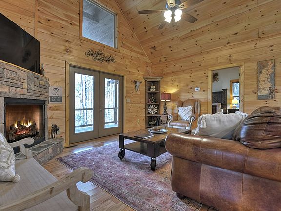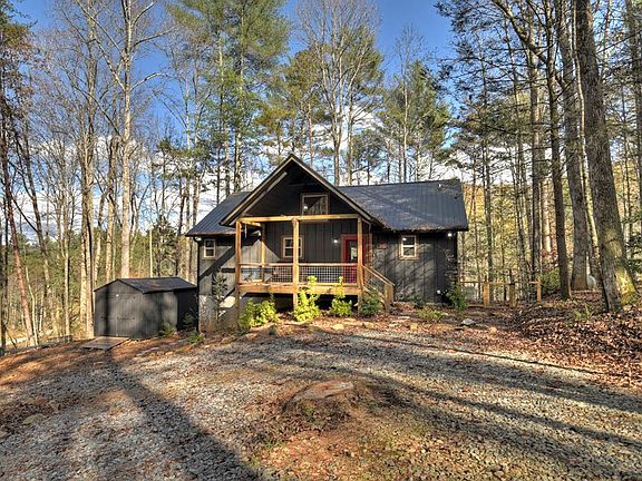 Featuring a modern twist on the classic cabin, this charming creekfront cabin displays a blend of textures and colors both inside and out creating a one-of-a-kind look. The modern exterior is painted and features stained wood trim, a metal roof, and the perfect pop of color with a beautiful red front door that leads into the warm & cozy interior. Inside you'll find two bedrooms and two bathrooms on the main level, along with a third bedroom and bathroom on the terrace level. The main level also features an open kitchen, dining area, and living room with access to the main level covered deck - the soaring ceilings unite these spaces, and they are perfectly accented with a stone fireplace. The main living space is comprised mostly wood while the bedrooms showcase a blend of drywall and wood. The primary suite offers a double vanity with tile floors and a custom tile shower. The kitchen features stainless steel appliances, and you're sure to enjoy the granite countertops throughout. In addition to the bedroom and bath previously mentioned, the terrace level also features a large open rec/media room and cozy lounge space (that would double as a fantastic office space). It also has its own access to the great outdoors that leads to the fenced backyard with hot tub and firepit area. Other highlights include: laundry on the main, detached storage building, creek frontage, seasonal mountain view, and the furnishings are negotiable making this cabin available turn-key! This cozy haven is located on the outskirts of both Blue Ridge and McCaysville, offering everything you can imagine at your fingertips. Great for full-time living, your own private getaway, or a rental investment, this home sweet home has just what you need - it's only missing you!