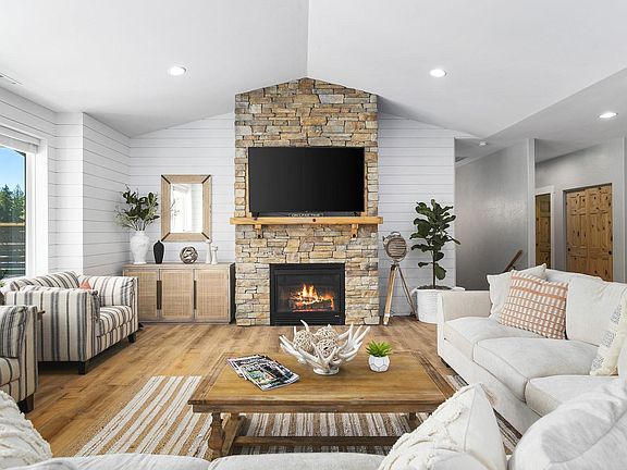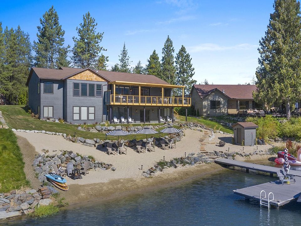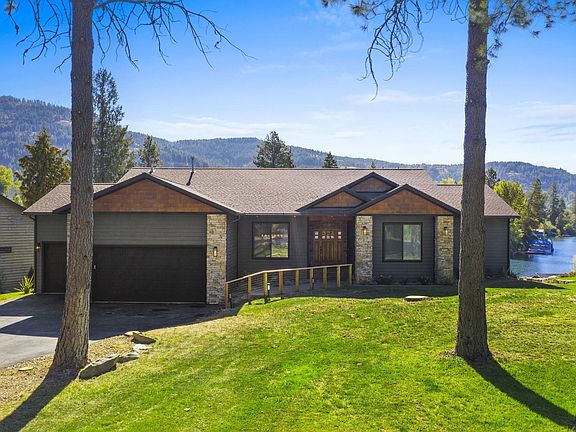 Gorgeous must-see 3,645 SF 5 Bed/3 Bath waterfront home on Fry Creek/Lake Pend Oreille w/private beach & dock. Stylishly remodeled from top to bottom in 2020 featuring a Designer Kitchen w/Viking, KitchenAid & Bosch appliances, floating shelves & shiplap siding. Bright & cheery Living Room w/stone gas fireplace flows outside to an expansive deck for effortless entertaining. Spacious Master Suite has jetted tub, separate vanities, & walk-in closet. Lower level Family Room opens to covered patio & lawn, landscaped w/sprinkler system. Peaceful, calm inlet provides a safe haven to swim, kayak, paddle & fish w/ minimal boat traffic, and the big lake is right around the bend. Easy year-round access to Hwy 95 North & South.