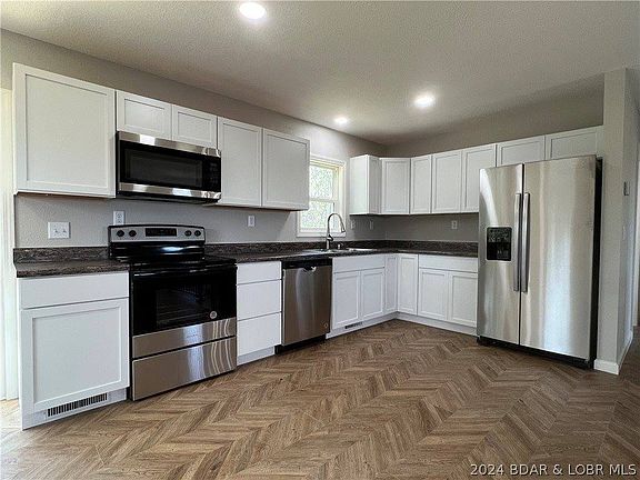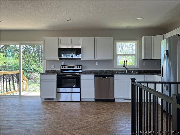 BRAND SPANKING NEW! Home has a warm cozy vibe as you cross the threshold! READY for you to add your personal touches and make this GEM your own! Open concept living room/cuisine area! Kitchen boosts of bright white cabinets w/recessed panel doors, complemented by darker countertops/backsplash, recessed lighting, stainless appliances and all elevated by the vinyl laminate plank flooring. Upper level bedroom has it's own private deck ready for you to enjoy your morning brew. Lower level bedroom is perfectly suited for the master, family room, office and or game/craft room..........Oversized single car garage complete with storage. Located in a pleasant quaint neighborhood that is close to the school and library. This humble abode is ONLY 13 miles from Camdenton city square and on city water. PERFECT for that first home buyer or if you're wanting to downsize.