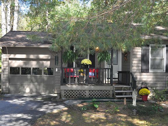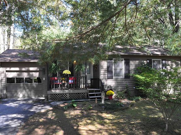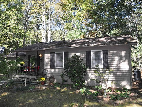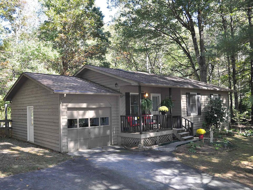 Cute and cozy in East Flat Rock's Cinnamon Woods Subdivision! Centered on an attractive, spacious lot with shade trees and a fully fenced back yard and additional dog lot off the primary bedroom. Covered front porch, a wrap around deck and patio area give plenty of space to relax and enjoy this excellent setting. The floorplan is open and skylights in the living room add extra natural light. There are hardwood floors throughout and there is a gas log fireplace unit in the living room. The gas furnace and central AC were replaced recently as was the hot water heater and a brand new garage door. Single car garage is attached and there is room to park additional vehicles. There is a community water system and the internet is provided by Optimum. Trash pickup is private.