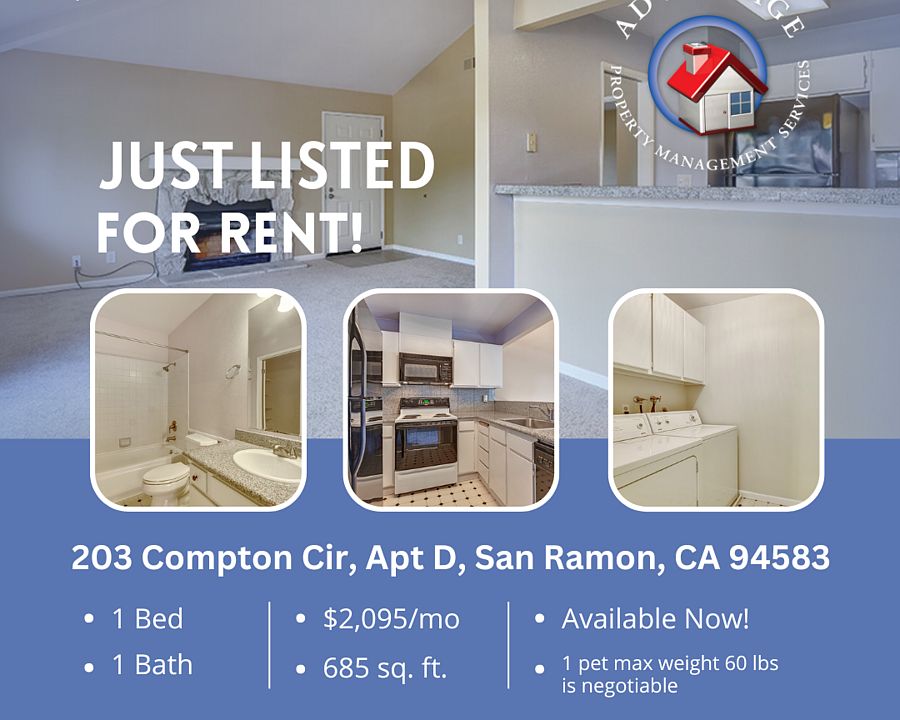 Schedule a Showing Online Don't miss out on this cozy 1 bedroom, 1 bathroom, 685 sq. ft. condo within walking distance of the grocery store and restaurants in Diablo Plaza shopping center. This second floor condo features vaulted ceilings, a separate dining room area, a large balcony with additional storage, a wood burning fireplace and your own laundry room. The property also comes with 2 carport spaces. This quiet, well-kept community offers access to a pool, and is in close proximity to the 680 freeway and Bishop Ranch Regional Preserve. We are looking for a tenant who will take excellent care of the condo. Available for move-in ASAP Rent: $2,095.00/month Security Deposit ranges from $2,620.00 - $4,190.00 unless you qualify for our zero security deposit option provided by Obligo. Applicants that do not meet all the Basic Criteria, but exceed the Minimum Criteria, may be approved with a higher security deposit. If you qualify for Obligo's service, you will not be required to pay a security deposit! Minimum Lease Term: 12 months Pet Policy: 1 pet max weight 60 lbs is negotiable with a $500/pet security deposit increase and a $30/month pet admin fee. Applicants with pets are required to submit a pet application through a third-party pet screening service at https apms. Refrigerator: Included Washer/Dryer: Included Gardening: Provided by HOA Parking: 2 carport spaces Utilities Included: Garbage, Water, Gas Showings are available by appointment only. Schedule a showing online by clicking the Schedule a Showing link. The property is professionally managed by Advantage Property Management Services. Leasing Contact: Harrison Smith (DRE# 01902063) READ THIS IMPORTANT INFORMATION BEFORE YOU SCHEDULE A SHOWING There is a $50/adult non-refundable application fee and ALL adults residing in the property must apply. We will (1) verify your identification; (2) check your credit report, unless you receive a Government Rent Subsidy and request to provide verifiable alternative evidence instead of a credit report no later than when the application is submitted; (3) verify your household income and employment, if applicable; and (4) verify your rental history with previous landlords. Most applications are processed in 2-3 business days from the date we receive a completed application and all supporting documentation. Security Deposits are calculated using a risk-based model. Applicants who meet all the Basic Criteria may be approved at the advertised security deposit amount. Applicants who do not meet the Basic Criteria but exceed the Minimum Criteria may be approved with a higher security deposit, not to exceed the legal maximum. We offer a security deposit-free option for qualified tenants using Obligo billing authorization technology. Security Deposits for active-duty military and properties subject to AB12 cannot exceed 1x the rent. Prior to move-in, proof of a current renters insurance policy with APMS listed as an Additional Interest and coverage of at least $300,000 for personal liability must be provided. Please DO NOT APPLY if your credit score is below 650, your household income is less than 2.7x the asking rent, you have ever been evicted, you have negative rental history, or your pets do not comply with this property's pet policy. If you have a Government Rent Subsidy and elect to provide verifiable alternative evidence of your reasonable ability to pay rent instead of a credit report, you must inform APMS when you submit a rental application. Failure to notify us at this time may disqualify you from participation in alternative verification. We will provide a list of required documentation after we receive a request. All documentation must be provided within 48-hours. Contact us to learn more about this process and the required documentation. All verifiable sources of income will be considered. Pursuant to CA Gov. Code 12955(o), the income multiple is based on the amount of rent that will be paid by the Applicant (not the total rent amount) if the Applicant has a rental voucher or other housing subsidy. To help ensure all residents understand our animal policies, all Applicants must submit an animal application at https apms. All Information Deemed Reliable But Not Guaranteed. APMS is not responsible for content published by third-party listing websites (i.e. Zillow, Trulia, Hotpads, etc). Central Heat/Air Community Pool/Spa Disposal Garbage Service Included Pets Allowed Refrigerator Included Views Washer/Dryer In Unit Washer/Dryer Provided