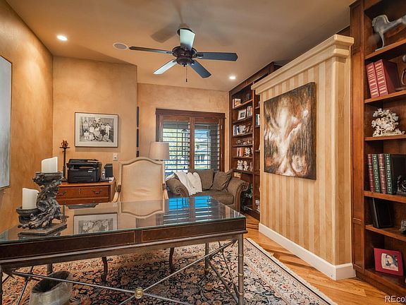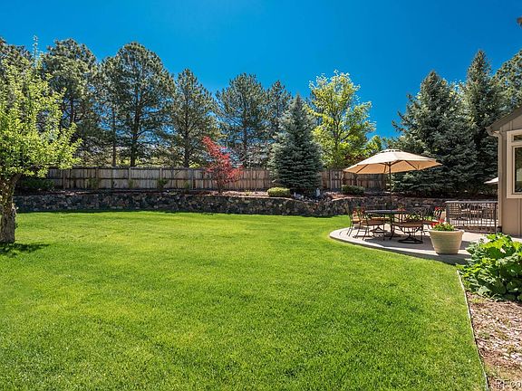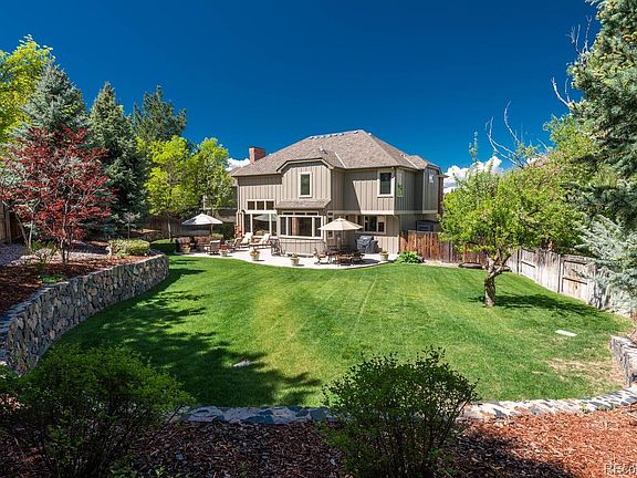 This Castle Pines home is what dreams are made of with its abundant upgrades and back yard oasis! The main level includes hardwood floors which greet you at the dramatic entry and extend throughout the main floor as well as the upper level. The main level includes a study with built-ins that makes the perfect work from home space, plantation shutters, built-in speakers (as well as on patio), central vac, Pella windows. The family room with its soaring ceiling, gas fireplace, and large windows allows for an abundance of natural light and views of the private park like back yard! The kitchen features the wow factor everyone is looking for, from granite countertops built-in refrigerator, pantry, stainless appliances, and eat in kitchen! The gorgeous wrought iron staircase leads you upstairs which features the primary bedroom with a gorgeous mountain views, an updated bathroom and large walk-in closet with beautiful built-in closet system. Three more secondary bedrooms and an additional full bath round out the upstairs which are perfect for kids and guests. The finished basement offers a bathroom, guest room, bar area and an additional rec room. The outdoor space is sure to impress with its lovely patio, large flat lot, mature trees, two sheds and privacy fence! Cul-de-sac location, top notch schools, close to trails and shopping make this home ideal!