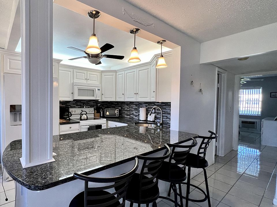 Gorgeous FIRST FLOOR 2/1.5 condo in 55+ Century Village! Meticulously maintained and very lightly used (only seasonally for a month or so at a time). Beautiful UPDATED & OPEN Kitchen with white cabinets, white appliances including a dishwasher and side by side refrigerator, tile backsplash, and an expanse of gorgeous granite counters! Full bath is updated with a step-in shower. Neutral tile flooring throughout the condo. Resident pavered patio with tropical landscaping. Sold AS IS and Furnished with tasteful lightly used furnishings (some items excluded). Century Village is a 55+ community with so much to offer... shows, movies, clubs, pools, security, and transportation service. The Clubhouse features a theater, indoor pool, card room, community/party room, billiard room, shuffleboard, tennis, pickleball, bocce, and two outdoor pools. Numerous heated outdoor pools throughout the community. Separate fitness center with gym and outdoor heated pool & resistance pool. Two guarded gates and 24-hour roving security patrol.