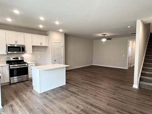 This home has a walk up Self-Tour option. This Custom Curated Carson plan has a spacious living room with Minka ceiling fan that leads right into a lovely open concept kitchen and dining area. Sherwin Williams City Loft interior paint keeps this home fresh and light but with a hint of classic sophistication. 5” wide Polaris Wild Dunes luxury vinyl plank flooring throughout 1st floor main living areas and window lined dining area lets just the right amount of light in. Kitchen includes Fulton Sugar white cabinets, Carrara White Quartz countertops, under cabinet lighting, Satin Nickel modern hardware and Fulton Sugar white island which creates a move-in-ready, perfectly designed kitchen for those who love to cook and entertain at the same time. GE Stainless appliances including gas range, microwave and dishwasher. This 3 bedroom, 2 ½ bath includes Shaw Midway Plaza Pebble Creek carpet in second floor bedrooms. Laundry room comes complete with hook up for washer /dryer and shelving for all your laundry accessories. Spacious owner’s bedroom with Tray Ceiling, Minka ceiling fan and walk-in closet. Beautifully designed owner’s bath has a full walk-in shower, Fulton Sugar white cabinets, Frost White Quartz top double vanity with white undermount sinks and Origins Aurora resilient flooring. Been looking to create that cozy outdoor space, well now you can out on your own rear covered porch. Just the right size for an outdoor loveseat, couple of chairs, outdoor rug and voila…. Your private Outdoor Oasis!